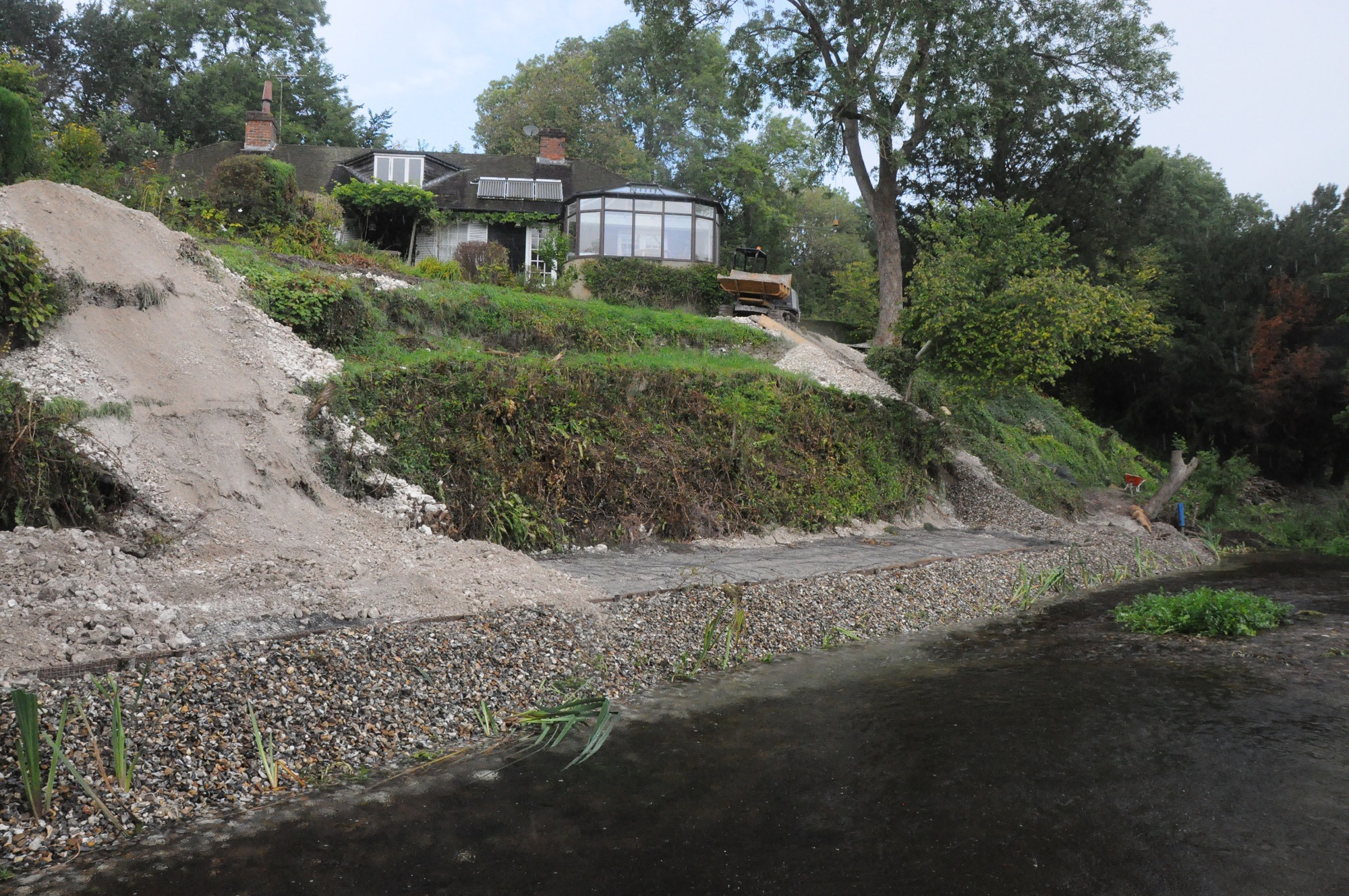 The steep and heavily eroded bank was stabilised by the installation of a chalk buttress at its toe.