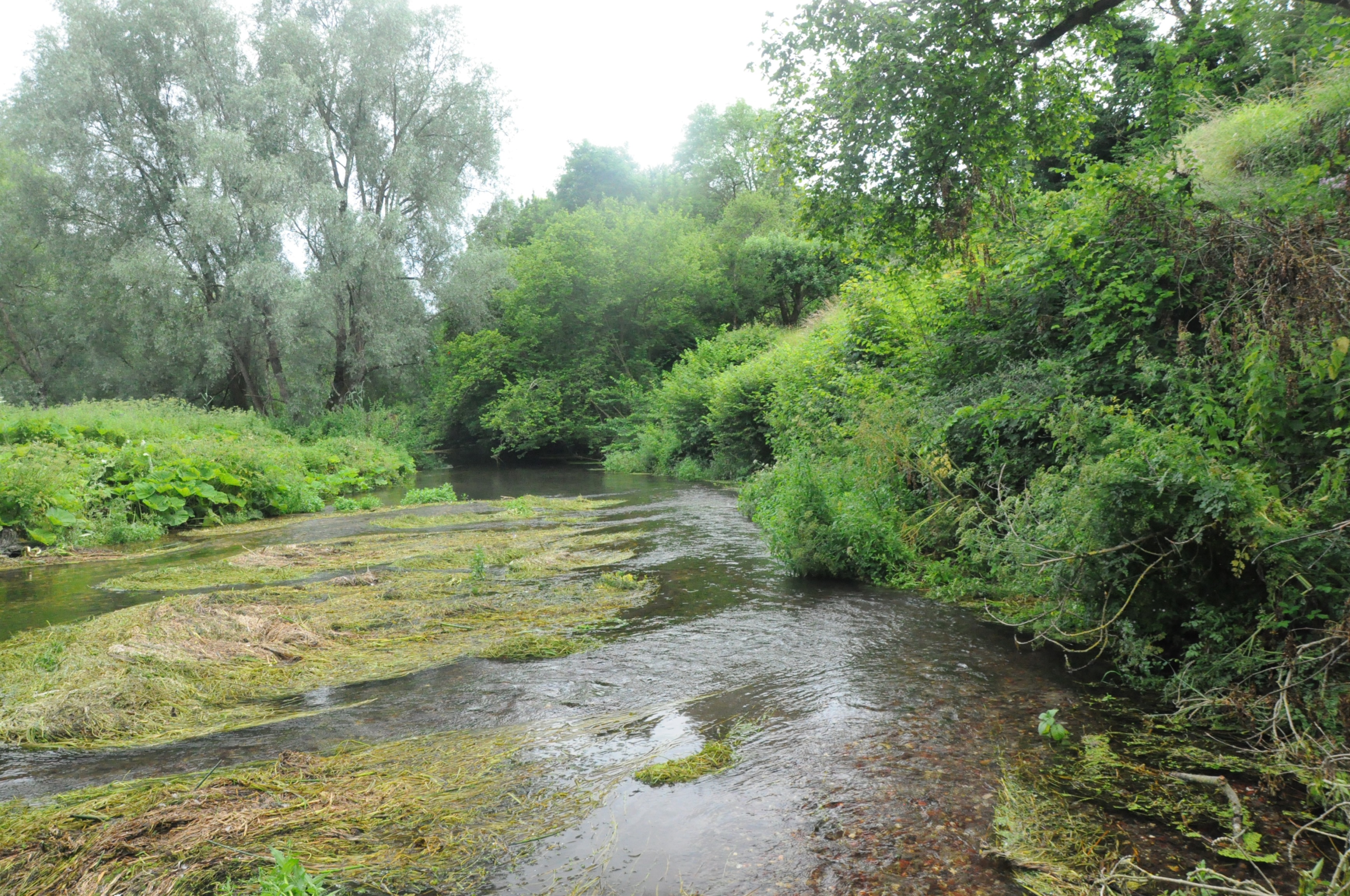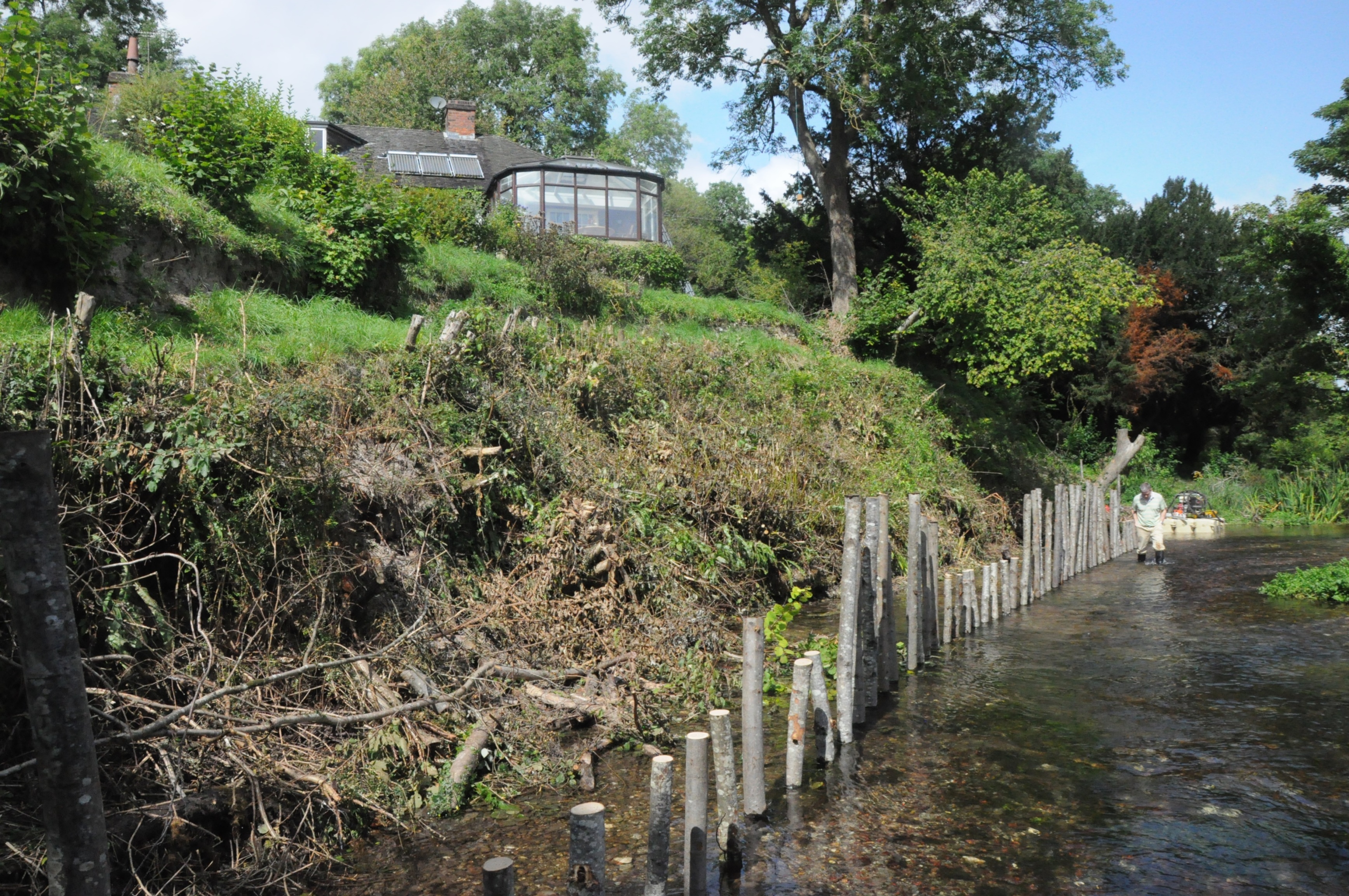 The steep and heavily eroded bank was stabilised by the installation of a chalk buttress at its toe. Further erosion to the banks is prevented by the revetment, and the redistribution of the channel gravel which centralises the flow of the river.