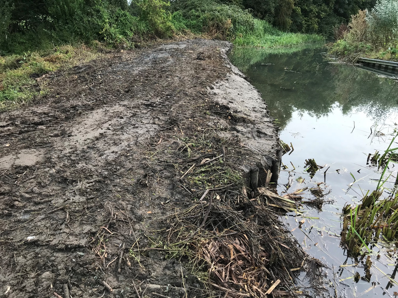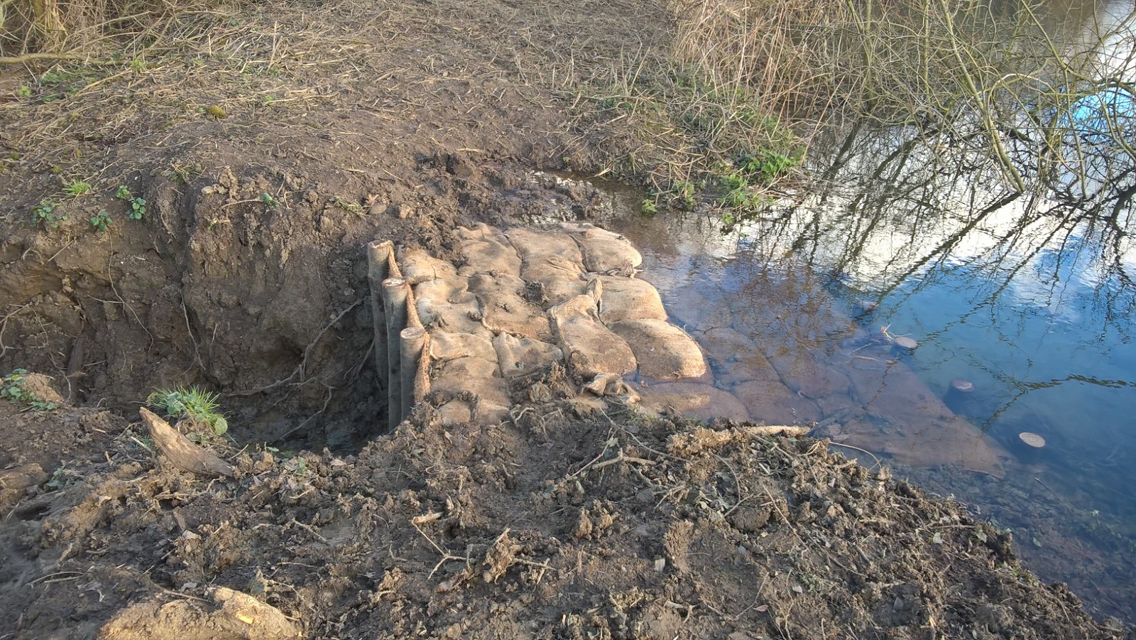 Having flooded a vast area of the neighbouring fields, an emergency solution was put in place by Cain Bio-Engineering in January of 2018 using sand bags and geo-textiles to contain the river. Later in the year, the temporary repair structure was removed and replaced by a solid and long lasting solution, protected from further erosion by a two-tier coirnet revetment.