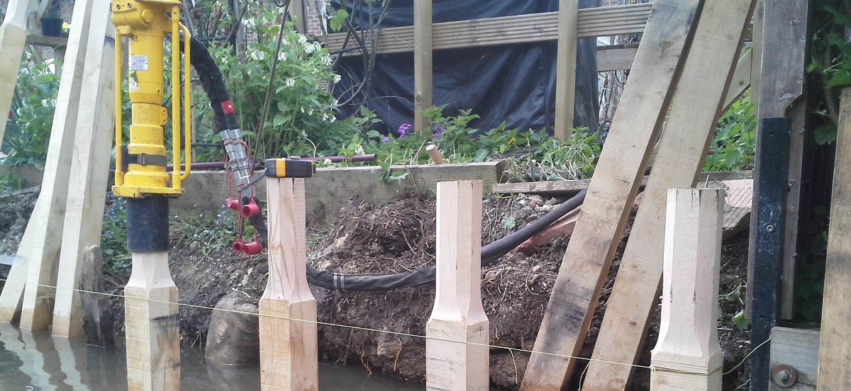During Construction: Oak posts hydraulically driven into the canal bed for firm embedment.
