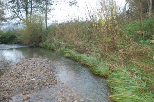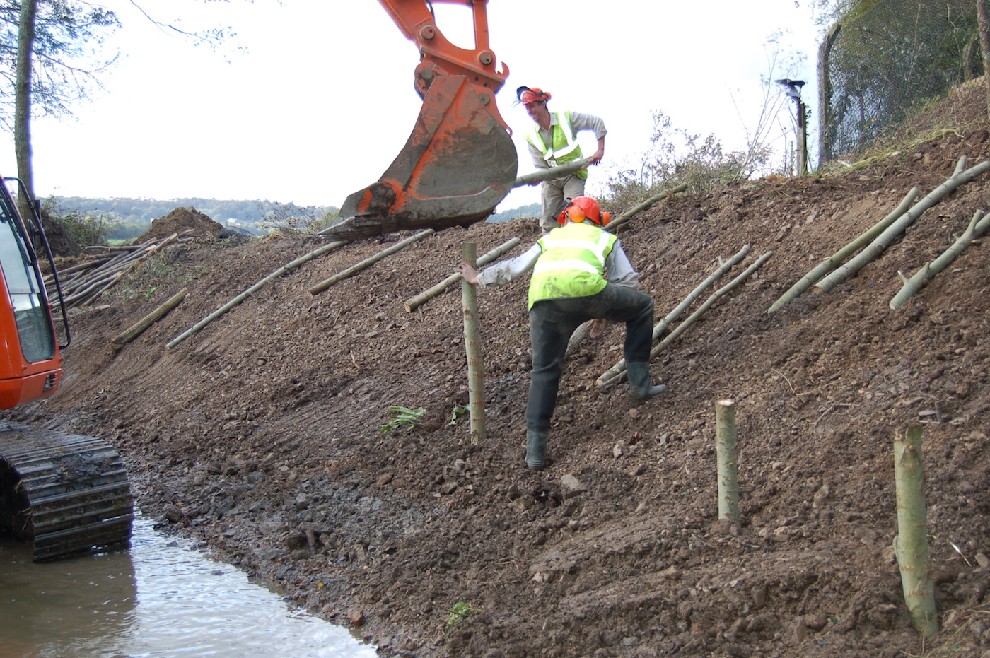 The completed structure was then top-dressed with a sacrificial layer of gravelly growing medium containing native root stock and seed bank, before site-won Willow stakes were cut from bankside saplings and driven into the new sloping bank. These provided the structure for the bio-element of the engineering.