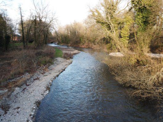 ‘X’ marks the spot where on 02/01/18 just three weeks after project completion a hen salmon was observed cutting a large redd on the recently-placed gravels. The up-welling of the 2m wide redd can be clearly seen.