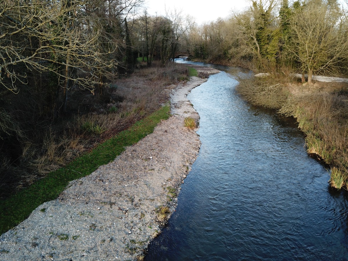 The primary objective in this reach was to re-size the linear over-wide channel and replace it with a double meander sequence and raised gravel bed to increase flow velocity and bed scour.